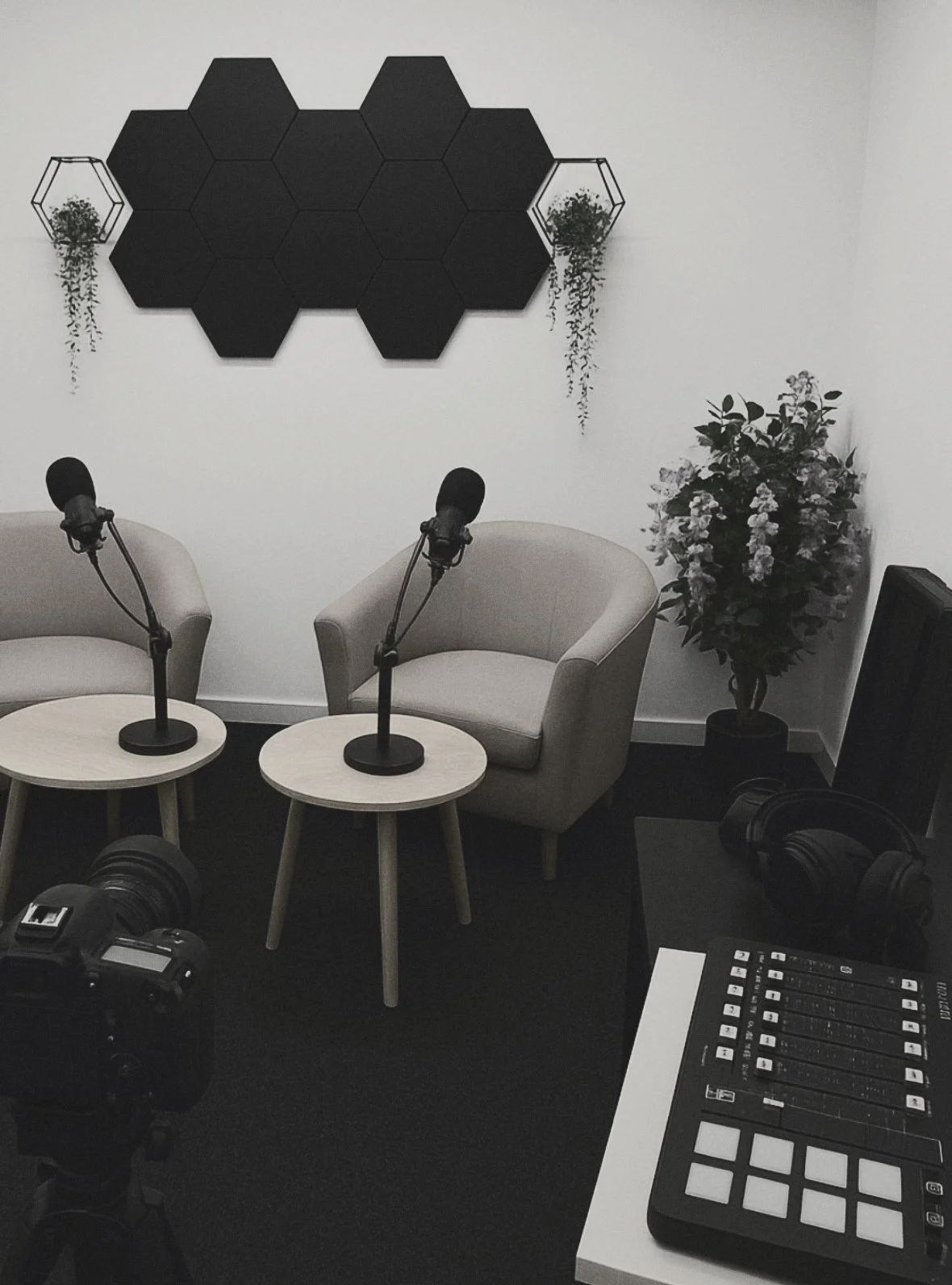 Step into a sound treated space designed for clarity, creativity and conversation. Our dedicated podcast room is fully equipped with state of the art/professional grade audio equipment, offering a pristine recording quality perfect for solo episodes or collaborative sessions.